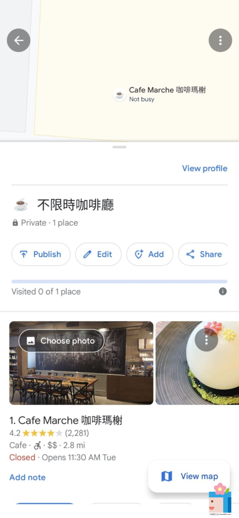 舉例來說,建立一個「不限時咖啡廳」的清單,將調查過的不限時咖啡廳存進其中。一旦將清單換成emoji後(下圖換成咖啡杯),平時用手機查找地點時,都能明顯看到。